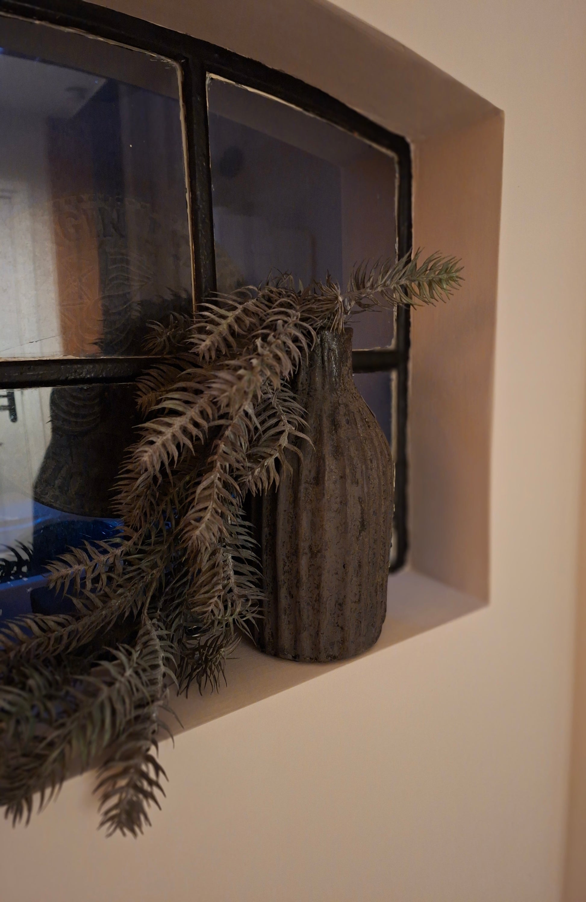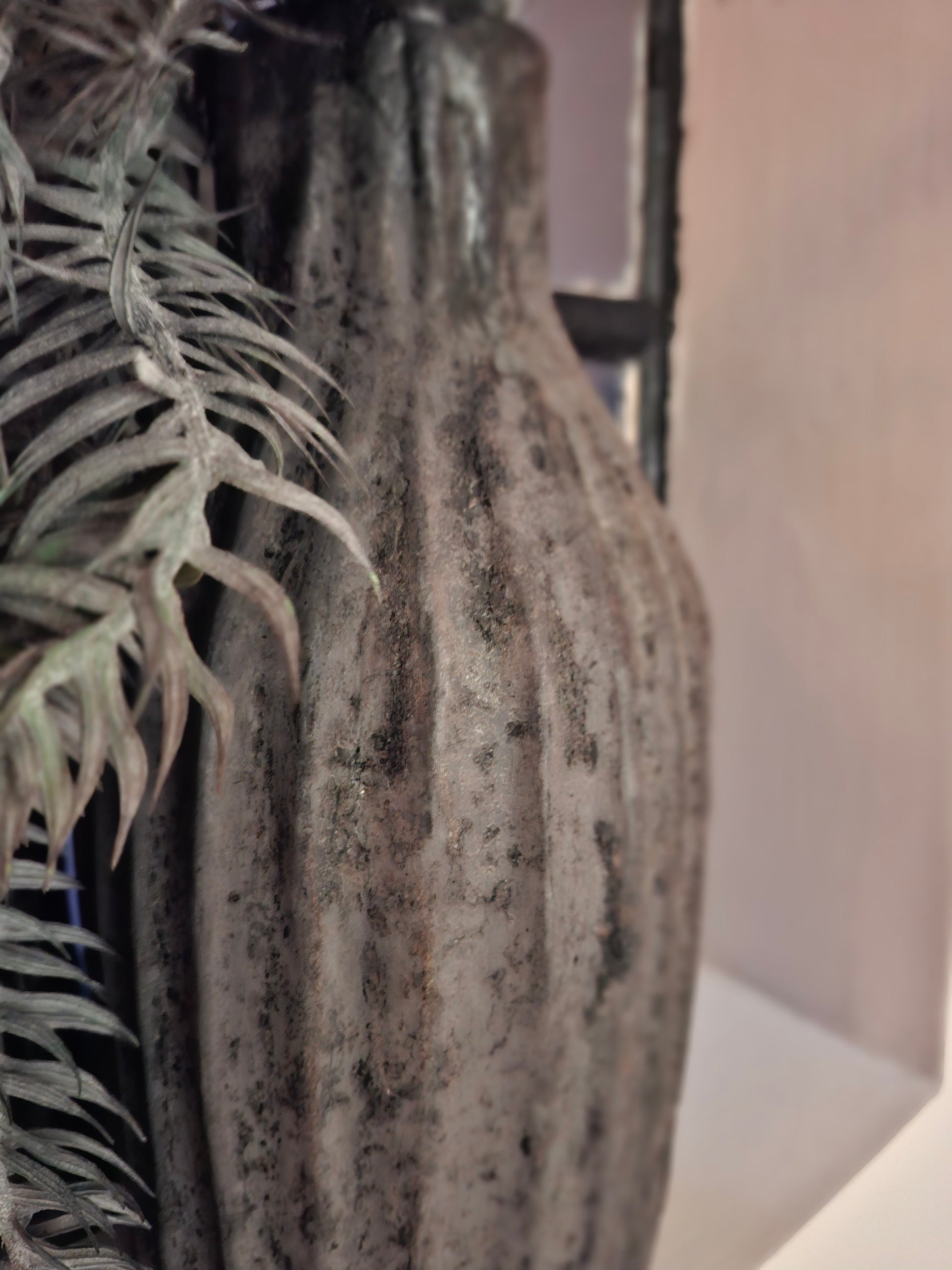 De donker grijze pot met ribbel is een krachtig decoratief item dat direct opvalt door zijn structuur en kleur. De ribbels geven diepte en zorgen voor een speels lichteffect, terwijl de donkere tint rust en warmte brengt.