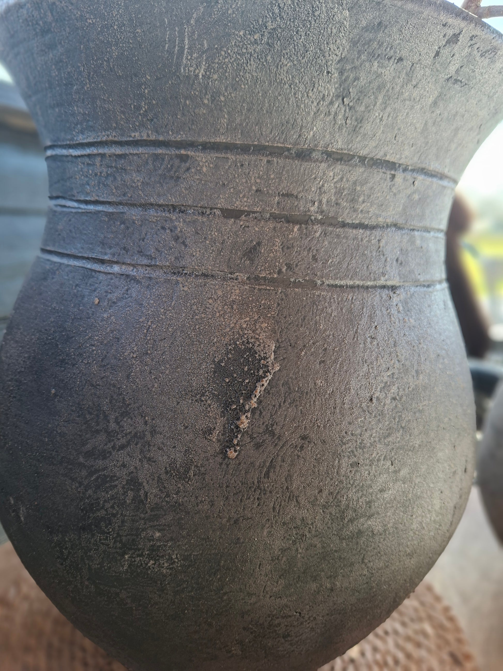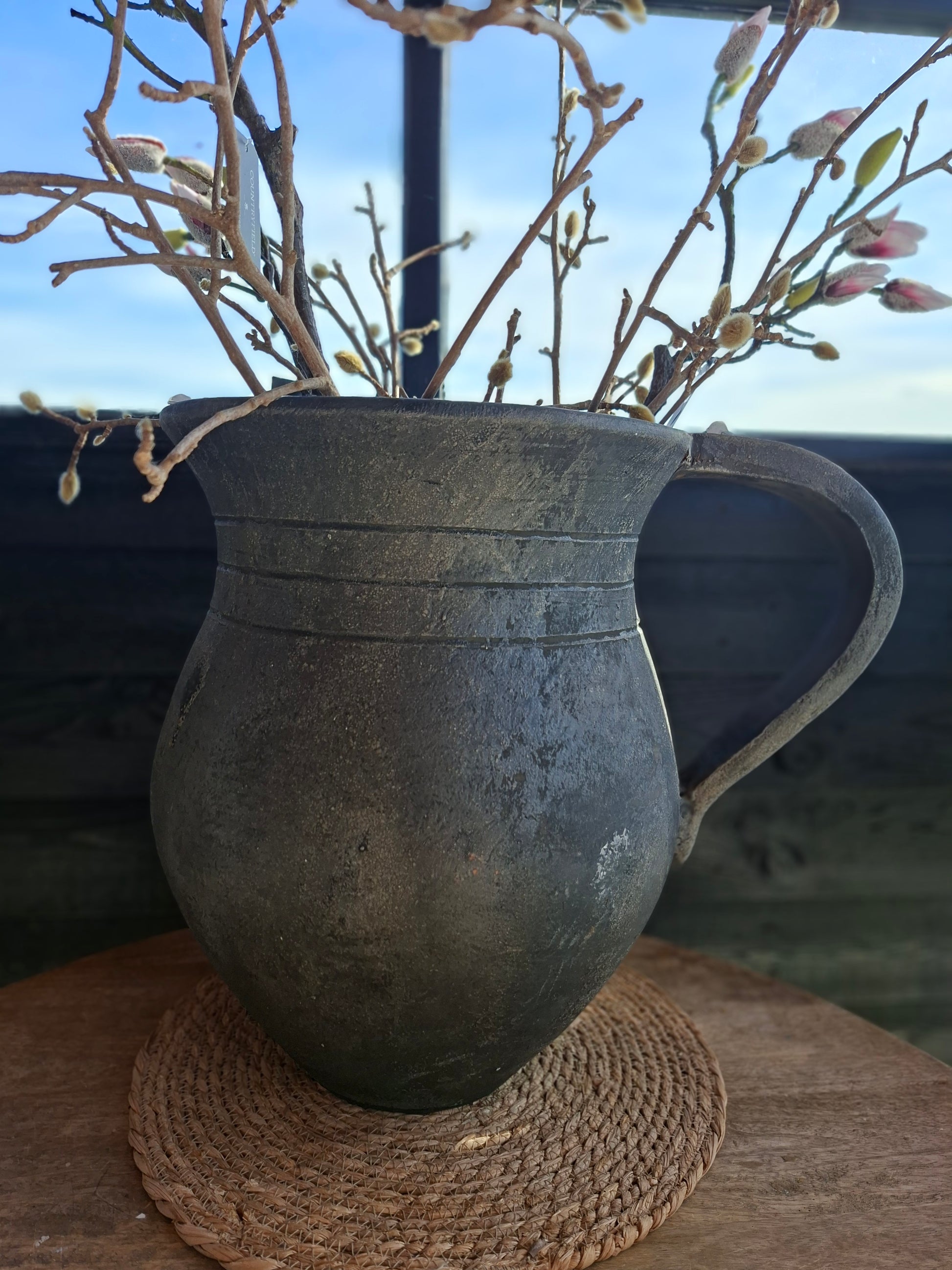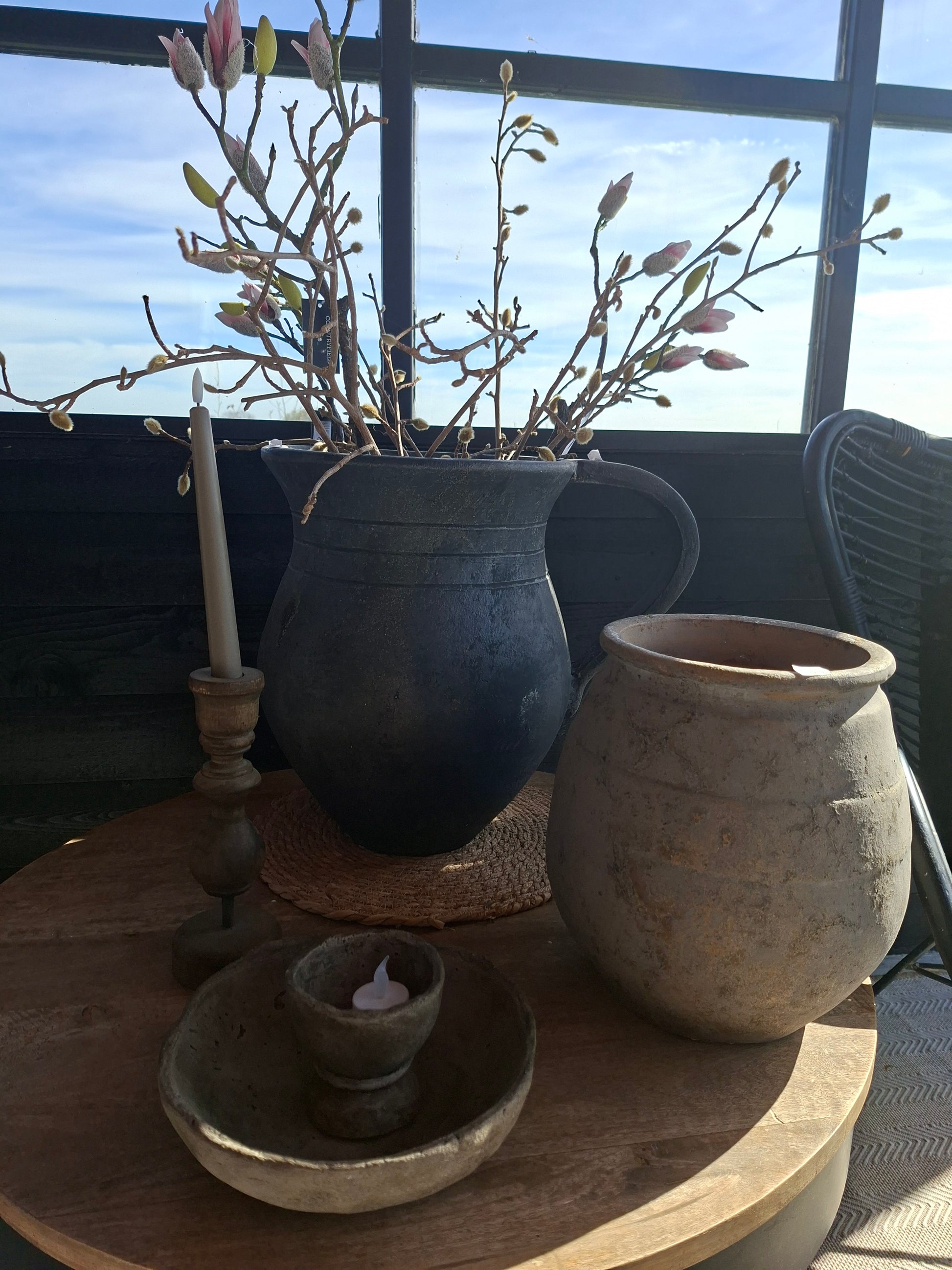 De grote grijze pot met oor is een echte blikvanger met een rustige, doorleefde uitstraling. De zachte grijstint zorgt voor balans, terwijl het oor een authentiek en karaktervol detail toevoegt.