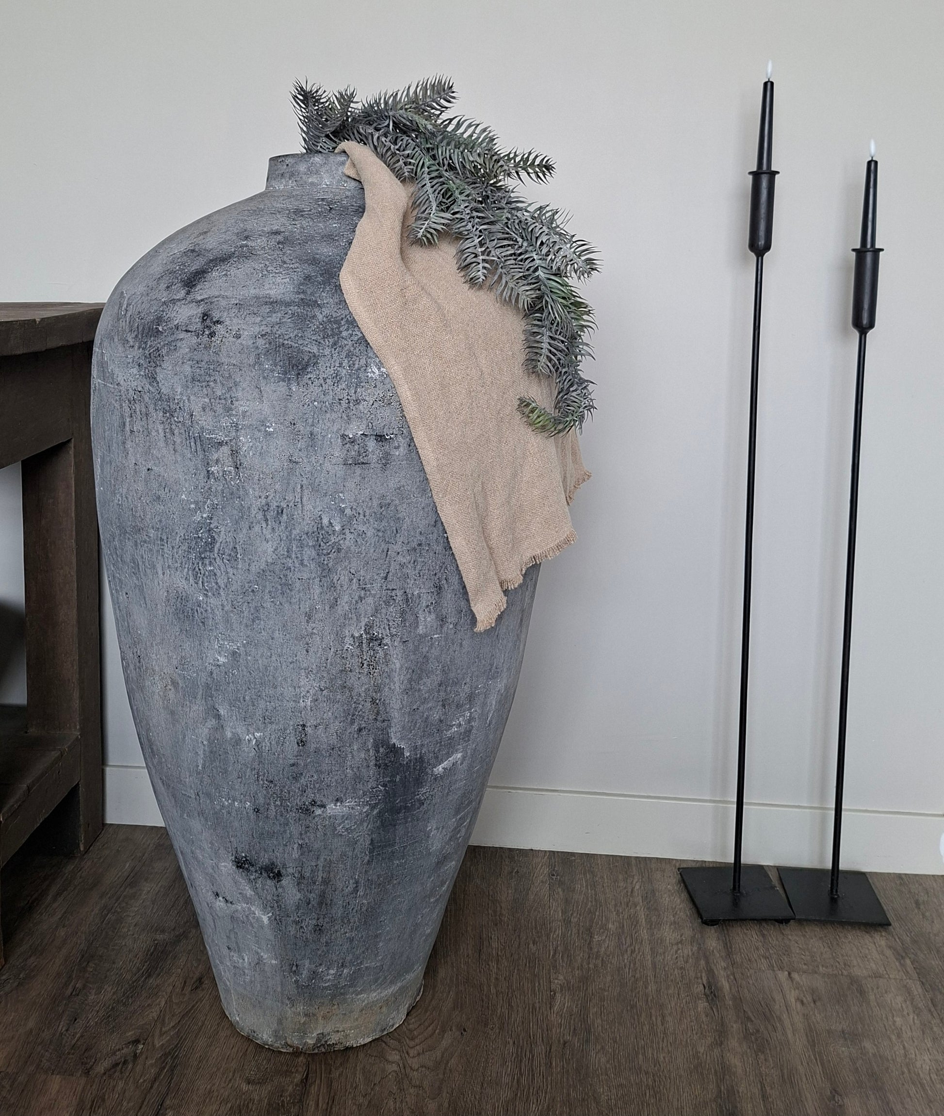 Plaats de pot op de vloer, op een tafel of op een dressoir en gebruik hem met een paar takken of zijdebloemen. Ook leeg is hij al een sterk decoratief object dat sfeer brengt.