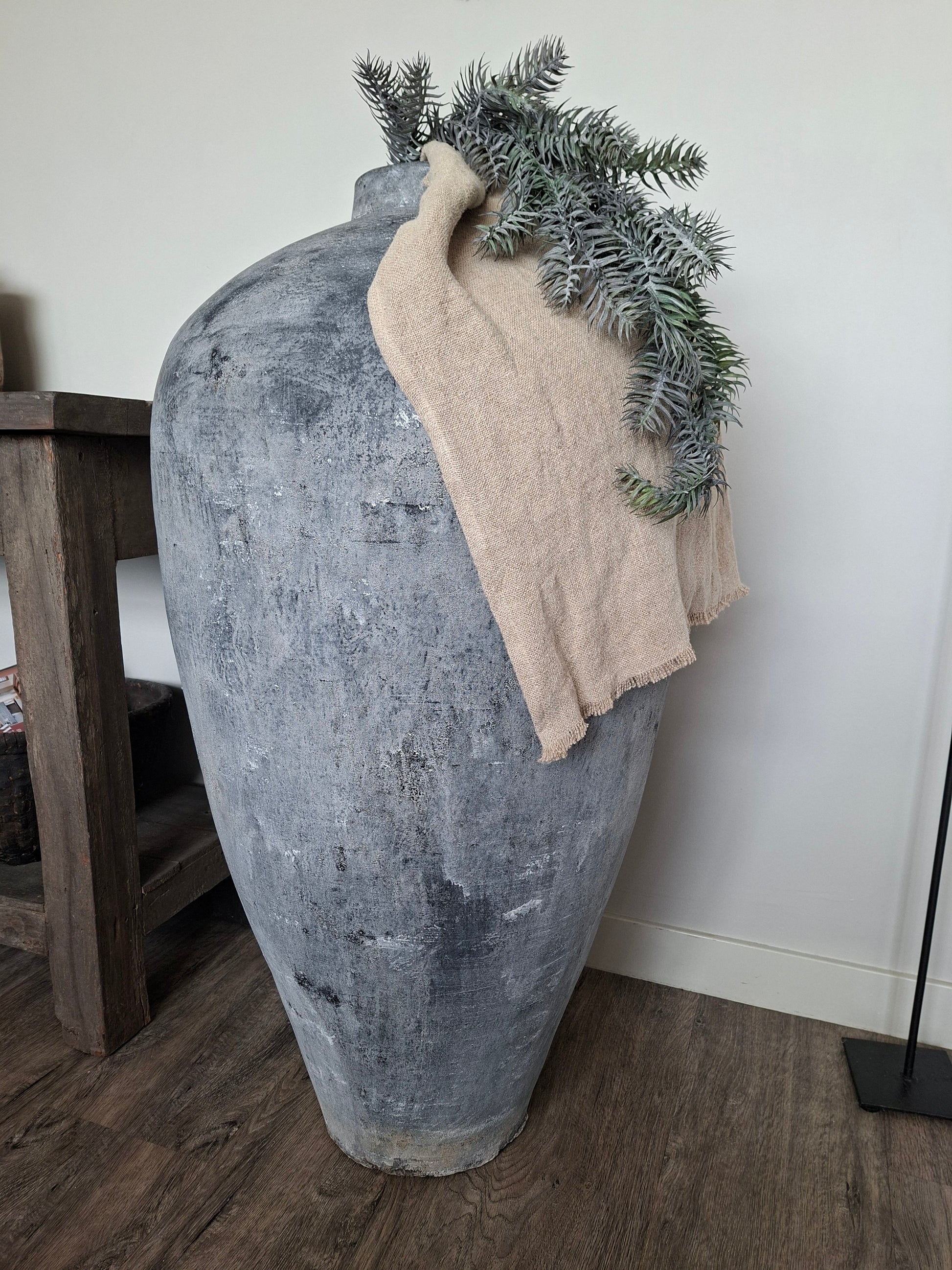 De grote stenen pot in grijs is een item dat direct opvalt door zijn formaat en uitstraling. De sobere kleur en het robuuste materiaal zorgen voor een rustige, maar karaktervolle toevoeging aan je interieur.